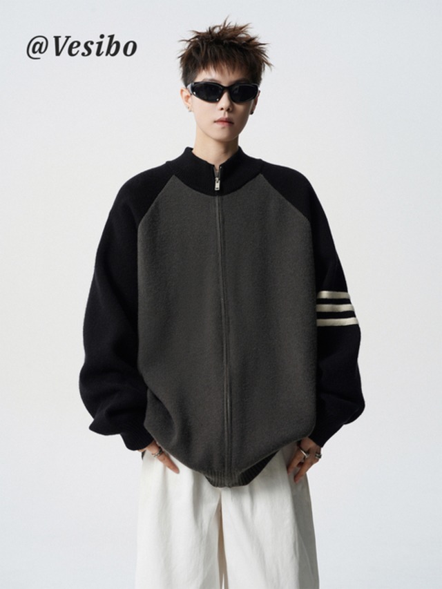 ブランドステッチコントラストカラーカーディガンストリートハンサムセーター