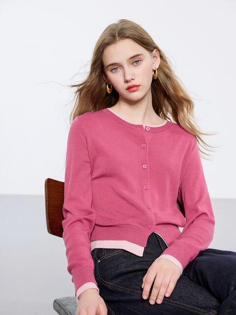 心地よい肌触りとカラフルなデザインが魅力の【トリコロールクリームセーター】ローズピンクフェイクセーターカーディガンジャケットが新たに登場しました!特別なマテリアルを使用したこのカーディガンは、カジュアルな日常スタイルからおしゃれなお出かけまで幅広く活躍する一着です。