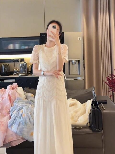 ・素材:ポリエステル75%、スパンデックス25%(柔らかく、伸縮性のある生地感が特徴です。半袖デザインとロングスカートのコンビネーションが女性らしさを引き立て、快適な着心地を提供します。また、通気性が良く、さまざまなシーンで積極的に着用できる一着です。)
