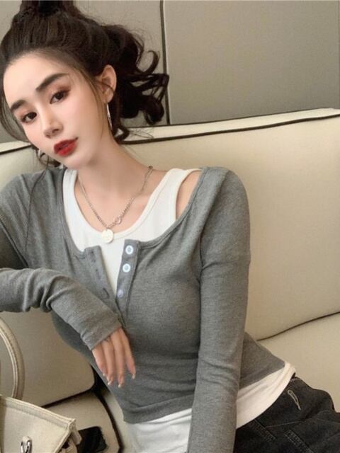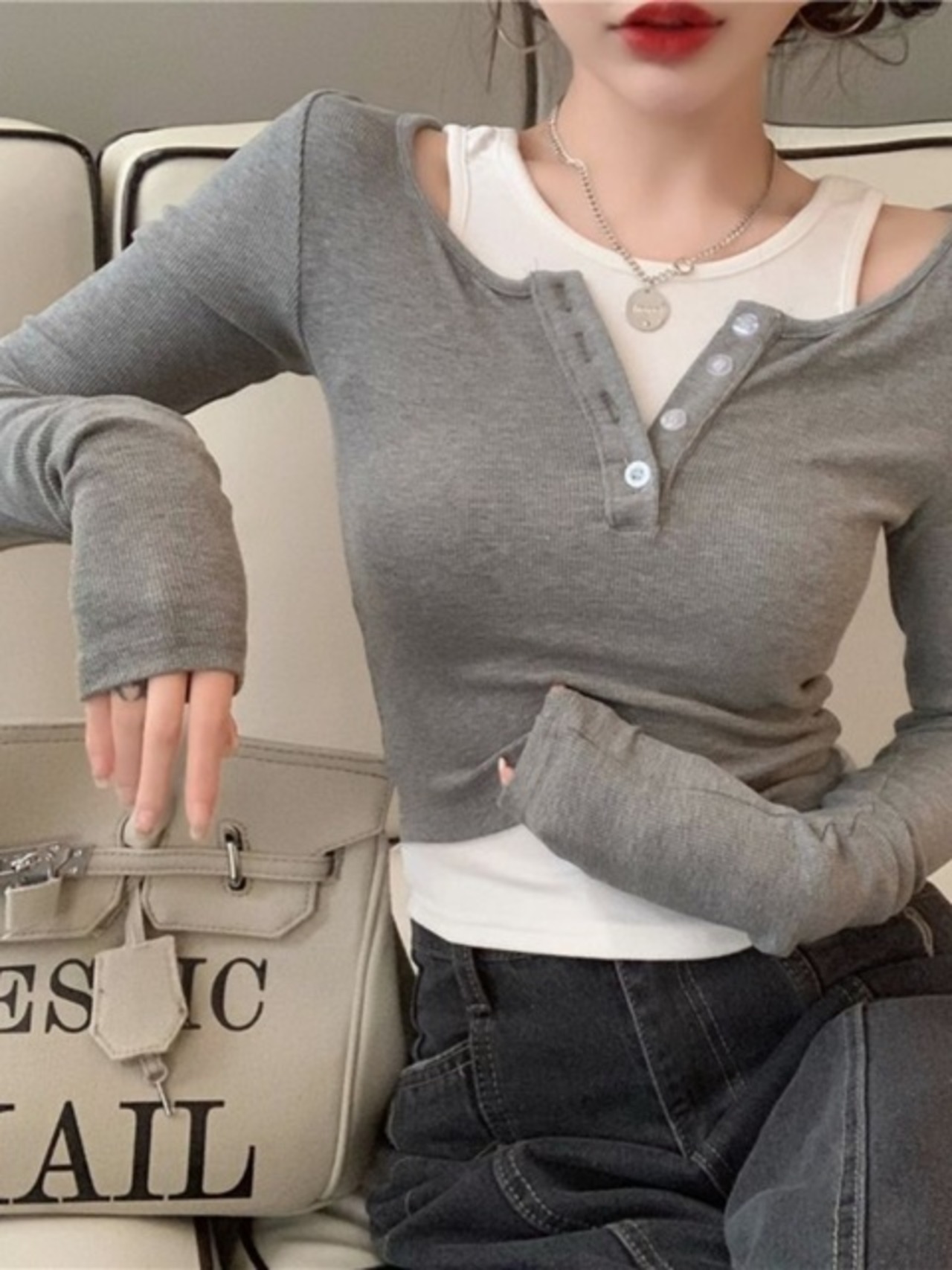 この【アメリカンスタイルのフェイクツーピースステッチラウンドネック長袖Tシャツ、秋冬用レディース、ホットガールスタイル、スリムフィットインナートップ】を取り入れることで、快適かつトレンディなおしゃれを楽しむことができます!ぜひこの魅力的なTシャツをあなたのワードローブに加えて、自分だけのスタイルを満喫してください!