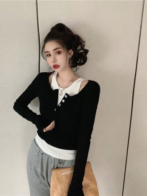 ・素材:コットンブレンド(柔らかな肌触りと適度な伸縮性が特長で、肌寒い季節でも快適に過ごせます。フェイクツーピースのデザインがトレンド感を演出し、スリムフィットなシルエットが女性らしいラインを強調。高いセンスを感じさせるスタイルを実現します。)