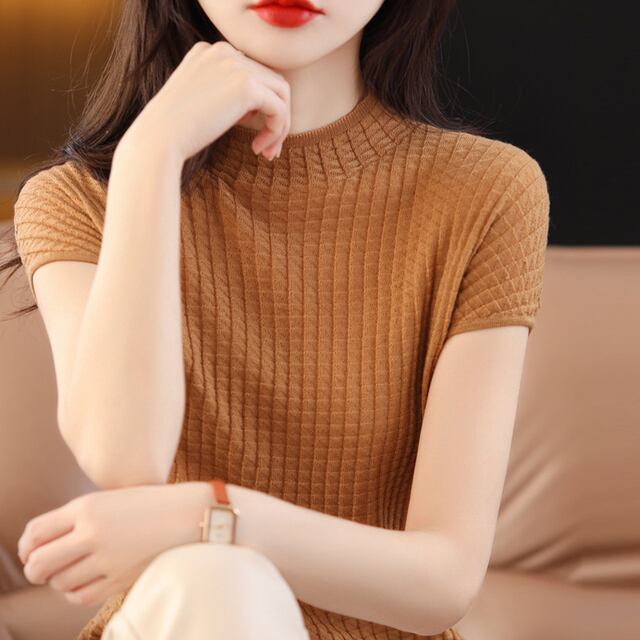 心地よいフィット感と洗練されたデザインが魅力の【極細梳毛ウールニット半袖レディース2022春夏新作ハーフハイカラー無地ゆったり多用途半袖Tシャツ】が新たに登場しました!このアイテムは、カジュアルなデイリーコーデから特別なシーンまで、幅広く活躍すること間違いなしの一枚です!