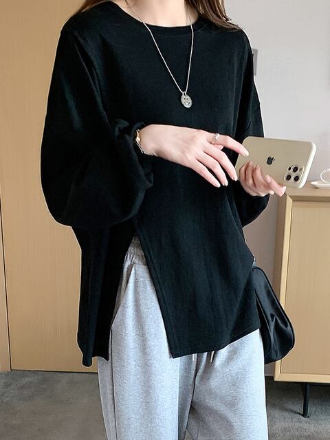 ・素材:軽やかなコットンブレンド(柔らかな肌触りと優れた通気性が特徴です。春秋の季節にぴったりのデザインで、特に不規則なスリットがアクセントとなり、シンプルながらもおしゃれな印象を与えます。)