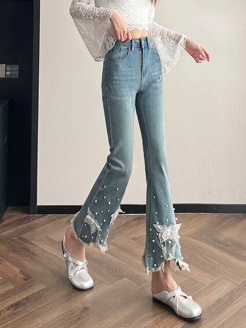 心地よい着け心地と華やかさが特徴の【ライトカラーフレア蝶々とパールのジーンズ】が新たに登場しました!このジーンズは、カジュアルな日常から特別なシーンまで幅広く活躍し、あなたのスタイルを一段と引き立てるアイテムです。フレアシルエットに施された蝶々とパールのディテールが、エレガントさと遊び心を演出します。