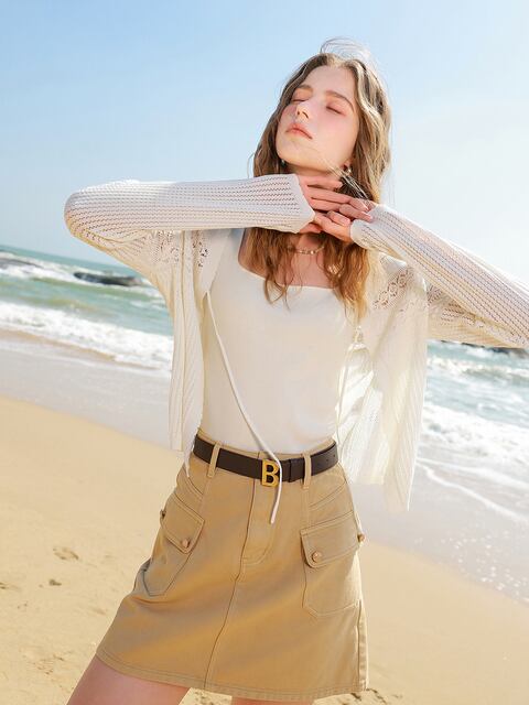 ・素材:リネンとアクリル混紡(軽やかな着心地で、通気性が優れた質感が特徴です。毛玉ができにくく、長く愛用できることを考慮したデザインが魅力です。このカーディガンは、どんなトップスやボトムスとも自由にコーディネートを楽しめる一着です。)