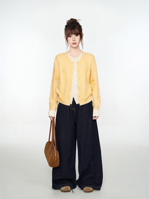 心地よい着心地と鮮やかな色合いが魅力の【イエローフェイクツーピース長袖ニットカーディガン】が新登場です!このカーディガンは、デイリースタイルから特別なシーンまで幅広くご使用いただけるアイテムです。ツーピースデザインが、温かさをしっかりと保ちながら、あなたのスタイルを一層引き立てます!