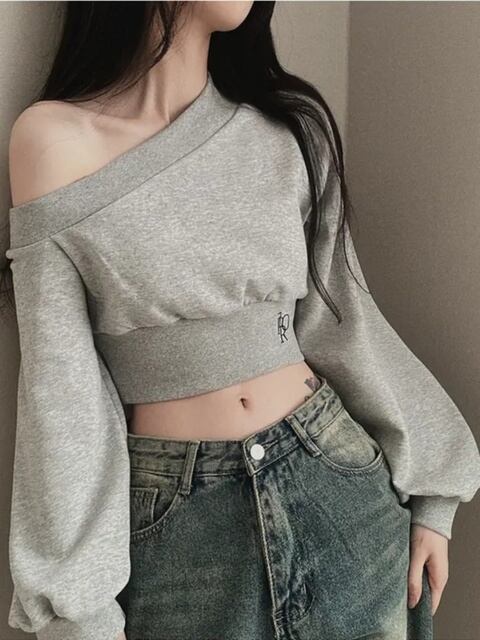 トレンド感満載の、斜め襟オフショルダートレーナーが新登場!独自のデザインと柔らかな素材を使用し、リラックスした着心地を実現しました。オフショルダースタイルが魅力的で、カジュアルなコーディネートに洗練された雰囲気をプラスします!