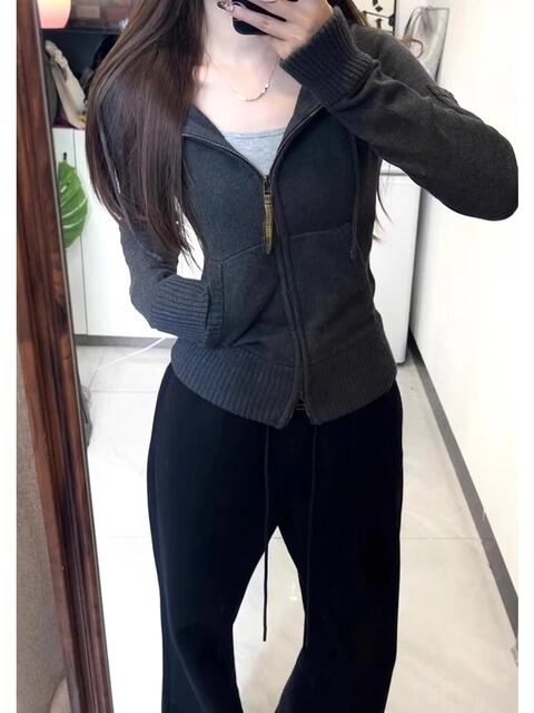# ジッパーフード付きショートスリムフィット韓国ニットセーターカーディガン
