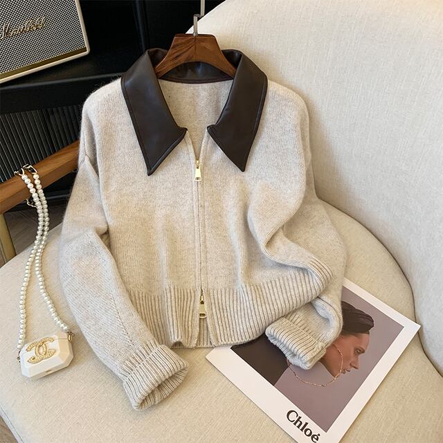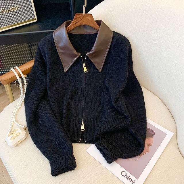# スモールフレグランススタイルレザーカラーダブルジップニットセーターカーディガンジャケット