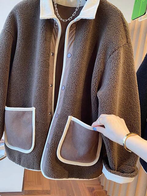 このコーデュロイラペルスプライシングラムウールルーズカジュアルスウェットシャツジャケットを羽織って、快適でスタイリッシュなオシャレを楽しんでみませんか?あなたのワードローブに、個性的な魅力と暖かさをプラスする素敵な一着を手に入れる良い機会となることでしょう!