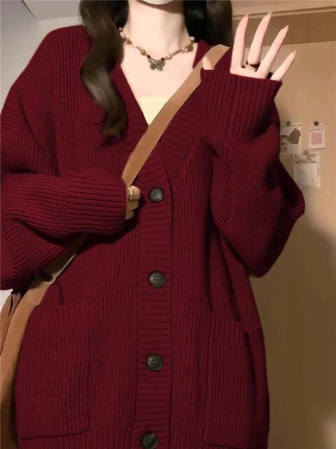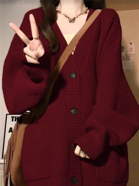 この【サイズワインレッドカーディガンニットセーター】を着用して、日常のコーディネートをより快適かつスタイリッシュに楽しんでください!ぜひこの特別な一着をあなたのワードローブに加えて、さまざまなスタイルを楽しんでください!