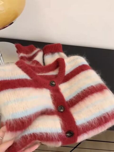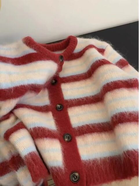 心地よい着心地と華やかなデザインが特徴の【赤いストライプ レディースベルベットショートニットカーディガン】が新登場しました!選りすぐりのベルベット素材を使用したこのカーディガンは、優れた保温性とトレンディなスタイルを兼ね備え、普段使いから特別なシーンまで幅広く活躍するアイテムです。