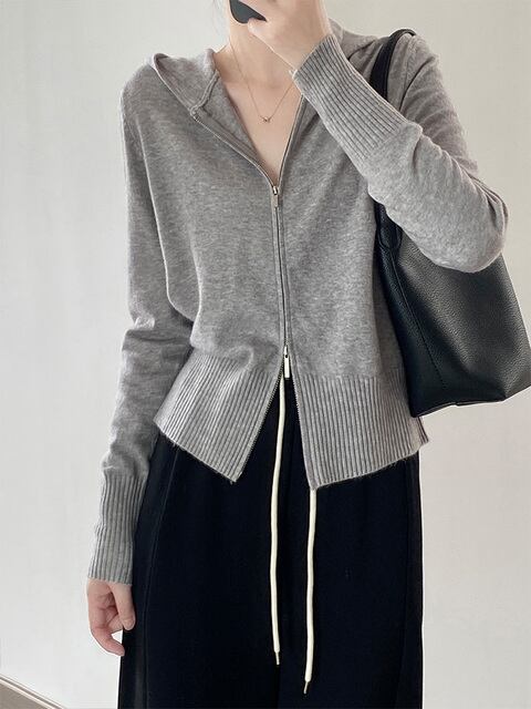 心地よい着心地と洗練されたデザインが魅力の【ダブルジッパーフード付きレディースカーディガンボトムスパーカーグレーセーター】が新たに登場しました!カジュアルなお出かけからリラックスタイムまで、幅広いシーンで大活躍する一着です。