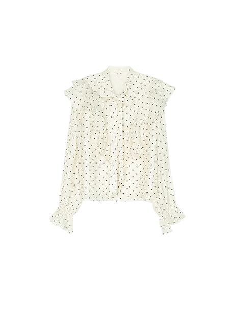 心地よい着心地と愛らしいデザインが魅力の【フレンチフリル水玉シャツ】が新たに登場しました!カジュアルなお出かけや特別なシーンにもぴったりな一着です。